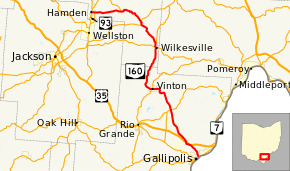 State Route 160 (SR 160) is a north–south state highway in the southeastern portion of the U.S. state of Ohio. Its southern terminus is at SR 7 in Gallipolis, and the route heads north. It meets U.S. Route 35 at an interchange with various collector and distributor ramps. SR 160 southbound bypasses the interchange on a 0.739-mile-long (1.189 km) road officially designated SR 160-A.[1] From there, the route passes through Vinton in northern Gallia County. Following an intersection with SR 32, the route heads in a more westerly direction until it meets and its northern terminus is at State Route 93 in Hamden.
