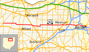 State Route 162 (SR 162) is an east–west state highway in the north central and northeastern parts of the U.S. state of Ohio. Its western terminus is in Republic at SR 18 and SR 67 and its eastern terminus is in Akron at SR 18 (the intersection of Rand and Market Street)[1] though signage along Market Street east of here shows it ending at High Street (SR 261 southbound).[2]