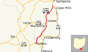 State Route 218 (SR 218) is a north–south state highway in the southern portion of the U.S. state of Ohio. The southern terminus of State Route 218 is at a T-intersection with State Route 217 approximately 5 miles (8.0 km) northwest of Athalia. Its northern terminus is at a T-intersection with State Route 7 about 2 miles (3.2 km) south of Gallipolis.