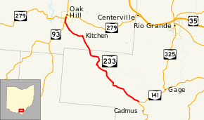 State Route 233 (SR 233) is an east–west state highway in the southeastern portion of Ohio, a U.S. state. The western terminus of State Route 233 is at a signalized intersection in Oak Hill where it meets the duplex of State Route 93 and State Route 279. The eastern terminus of this state route is at a T-intersection with State Route 141 in the heart of the Wayne National Forest approximately 4 miles (6.4 km) northwest of the unincorporated community of Patriot.