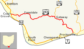 State Route 243 (SR 243) is an east–west state highway in the southern portion of the U.S. state of Ohio. The western terminus of SR 243 is at a diamond interchange with the U.S. Route 52 (US 52) in Coal Grove. The eastern terminus of the state highway is at its signalized junction with State Route 7 approximately 1.25 miles (2.01 km) west of Proctorville near the northern banks of the Ohio River.