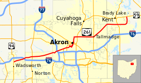State Route 261 (SR 261) is an east–west state highway located in northeastern Ohio that passes through Medina, Summit, and Portage counties. At a length of 26 miles (42 km), SR 261 runs from a signalized intersection with SR 94 in Wadsworth to a signalized T-intersection with SR 59 in Franklin Township just east of Kent.
