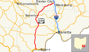 State Route 339 (SR 339) is a north–south state highway in southeastern Ohio, a U.S. state. The southern terminus of SR 339 is at SR 618 approximately 2 miles (3.2 km) west of Belpre, and less than 0.50 miles (0.80 km) south of the U.S. Route 50 (US 50)/SR 7/SR 32 expressway. The highway's northern terminus is a T-intersection with SR 821 about 0.75 miles (1.21 km) south of Dexter City.