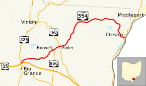 State Route 554 (SR 554) is an east–west state highway located in the southeastern corner of Ohio, a U.S. state. The western terminus of State Route 554 is at State Route 325 about 1 mile (1.6 km) north of Rio Grande, and just 1 block north of the State Route 325 interchange off of U.S. Route 35. Its eastern terminus is at a signalized intersection with State Route 7 in Cheshire a mere two blocks west of the Ohio River.