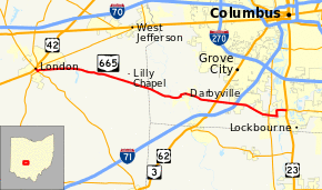 State Route 665 (SR 665) is an east–west state highway located in central Ohio, a U.S. state. The western terminus of this state highway is at a signalized intersection that marks the confluence of US 42, SR 38, SR 56 and SR 142 in downtown London. Its eastern terminus is at an intersection with US 23 and SR 317 approximately 2.50 miles (4.02 km) northwest of the village of Lockbourne.