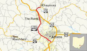 State Route 682 (SR 682) is a north–south state highway in the southeastern portion of the U.S. state of Ohio. The southern terminus of State Route 682 is at a trumpet interchange with US 33, US 50 and SR 32 in Athens. Its northern terminus is at SR 13 in the village of Chauncey, Ohio.