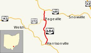 State Route 684 (SR 684) is a short north–south state highway in the southern portion of Ohio. Its southern terminus is at State Route 143 in the unincorporated community of Harrisonville, and its northern terminus is at State Route 681 near the community of Pageville.