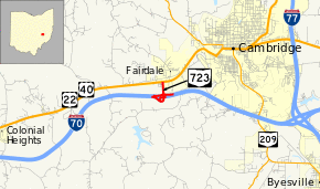 State Route 723 (SR 723) is a very short state highway located in east-central Ohio. Having a length of just 0.85 miles (1.37 km) and located just southwest of Cambridge, the route serves as a connector between Interstate 70 (I-70) at its exit 176 and the concurrency of U.S. Route 22 (US 22) and US 40.