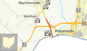 State Route 852 (SR 852) is a north–south state highway in the southern portion of the U.S. state of Ohio. Its southern terminus is at the Kentucky state line on the Carl Perkins Memorial Bridge over the Ohio River near Portsmouth, and its northern terminus is at an interchange with the State Route 73/State Route 104 concurrency, just north of a complex interchange with U.S. Route 52 about 1.75 miles (2.82 km) west of Portsmouth.