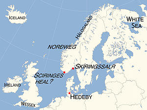 Sciringes heal has been held to represent Skiringssal (Old Norse: Skíringssalr) in almost all relevant historical writing since the early 19th century, mainly by reason of the superficial similarity of the names, to the extent that some modern translations of Ohthere's account feature the name "Skiringssal" in place of "Sciringes heal".[66] Skiringssal is a historical location, mentioned in Scandinavian sagas, which has been identified with some certainty as an area comparable to the parish of Tjølling, a little over 3 miles (5 km) east of Larvik, with important Viking Age archaeological sites at Huseby, just south of Tjølling, and at Kaupang, near the shoreline south-west of Tjølling, in the south-eastern county of Vestfold in modern Norway.[67][Fn 15] An alternative view is that an identification of Sciringes heal with Skiringssal is impossible to reconcile with the detail of Ohthere's account, and is unlikely for historical and linguistic reasons.[71][Fn 16] According to this interpretation, a location for Sciringes heal west of Lindesnes, the southernmost extremity of Norway, is to be preferred, perhaps at Lunde on the Lista peninsula.[76] Whether Sciringes heal was identical with Skiringssal, or was located in Tjølling parish or west of Lindesnes, it is described in Ohthere's account in the Old English Orosius as a "port" (an port).[51] Ohthere's account uses the same word for the Danish trading settlement of Hedeby (þæm porte), suggesting that Sciringes heal may have been similar in nature, though the Old English word "port" can signify nothing more than a haven.[77][Fn 17]