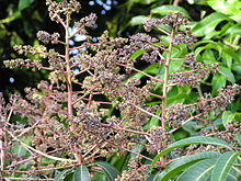 Mangoes are a commercial fruit crop of the cashew family (Anacardiaceae) which are an important crop in many countries including India, China, Pakistan, Mexico and Thailand. There are many species of mango, but the only one raised for commercial fruit production is Mangifera indica, as the fruit it bears is the most appealing and edible.[5] Originally cultivated in India beginning more than 5,000 years ago, mangoes currently represent up to 50% of international fruit production.[6] Mangoes are susceptible to a large variety of pathogens, including root rot, anthracnose, die back, and leaf spot, among others. However, one of the most prevalent and damaging diseases of this crop is powdery mildew of mango, caused by Oidium mangiferae; crop losses between 20 and 90 percent have been reported from various regions due to powdery mildew infections.[7] Most mango cultivars in use today were released from 1949–1967, with continuous cultivation since that time.[8] Long term cultivation may affect disease resistance, and very little breeding for resistant varieties has been undertaken; due to this, almost all cultivars show susceptibility to O. mangiferae and it is extremely widespread. The most popular variety of mango, the Tommy Atkins, was developed in the 1920s in Florida and is favored because of its long shelf life and anthracnose resistance, though it is still somewhat susceptible to powdery mildew and control strategies must still be enacted.[9] Diseases of perennial crops such as mango are devastating due to the long time period to maturity for the plants, as a tree grown from seed will not produce fruit until it has reached three to six years of age. In contrast, the mango tree may live and produce fruit for several hundred years if it remains healthy and is well cared for.[10] In addition, perennial crops can allow for buildup of inoculum and widespread dispersal of pathogens such as powdery mildew because the host is present in all seasons and through multiple years.[6]