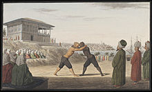 Oil wrestling can be traced back to the ancient Sumer and Babylon.[7] Greco-Roman traditions also point to the practice of oil wrestling.[8]