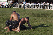 Oil wrestling (Turkish: Yağlı güreş), also called grease wrestling,[1] is the Turkish national sport. It is so called because the wrestlers douse themselves with olive oil. The term "Güreş" is shared with other forms of wrestling practiced by Turkic speakers across Europe and Central Asia, such as the Uzbek kurash, Tuvan khuresh and Tatar köräş. The wrestlers, known as pehlivan (meaning "hero" or "champion"), wear a type of hand-stitched leather trousers called a kisbet (sometimes kispet), which is traditionally made of water buffalo hide, and most recently has been made of calfskin.