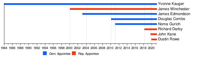 Joseph M. Watt | 1992 | 2017 | David Walters | Mary Fallin | 15 years | Richard Darby |