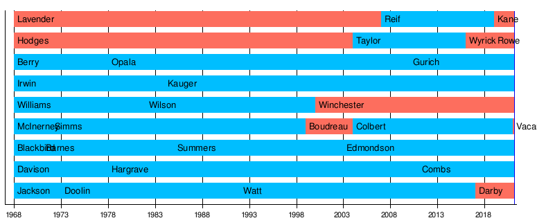 Note 2: Justices Lavender and Hodges were both appointed by Republican Governor Henry Bellmon in 1965 prior to the adoption of the new appointment method. Justice Lavender was a registered Republican while Justice Hodges was a registered Democrat.