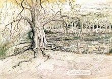 Old Man Willow is a malign tree-spirit of great age in Tom Bombadil's Old Forest, appearing physically as a large willow tree beside the River Withywindle, but spreading his influence throughout the forest.[T 1][5][T 13] He casts a spell on the hobbits, trapping two of them; they are rescued by Tom Bombadil.[T 1] Bombadil explains that they tree was wholly evil, and had grown to control most of the Old Forest.[T 14] Tolkien made a drawing of Old Man Willow, from an unpollarded tree by the river in Oxford, to support his writing.[4] The evil tree has puzzled critics, as it does not fit with Tolkien's image as an environmentalist "tree-hugger"; others have noted that trees too are seen by Christians as affected by the Biblical Fall of Man.[5][6][7] [8]