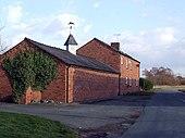 Austerson Hall (SJ652475) is a farmhouse dating from the late 17th century. In brick with a roughcast finish, it follows a T-shaped plan and is grade II listed.[19] Church House Farm (SJ650504) is an L-shaped, red-brick former farmhouse dating from around 1820. It has been used as a nursing home since 1989, and is also listed at grade II.[18][20] The timber-framed Elizabethan building of Austerson Old Hall or Old Hall Farm was moved to Alvanley in 1974.[21] A grade-II-listed barn remains which dates from the late 16th century, and is brick nogged with a timber frame.[22]