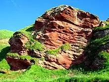 There are a scatter of exposures of the Old Red Sandstone around Oban and the Isle of Kerrera on the West Highland coast, this unit is sometimes referred to as the Kerrera Sandstone Formation. The unit is up to 128m thick in its type area and consists of green and red sandstones and conglomerates, typically containing large (10–30 cm or 4–12 in across) elliptical well rounded clasts, accompanied by siltstones, mudstones and limestones.[6] On Kerrera a conglomerate of andesite boulders rests unconformably on Dalradian black, pyritic slates (Easdale Slate) of the Easdale Subgroup. On Oban there is merely an erosional contact incorporating debris of the slate in a basal conglomerate. The ORS around Oban are considered latest Silurian (Pridoli) to earliest Devonian in age. They are interpreted as alluvial fans which filled a depositional basin from the east and northeast.[7] Small outliers occur near Taynuilt and either side of Loch Avich.[8] The deposits are especially obvious on Kerrera where they form the bedrock across half of the island.[9] These are conformably overlain by peperite and the basaltic and andesitic Lorne plateau lavas. The ORS on Kerrera and isolated localities around Oban are known for their fossils, particularly fish.[10]