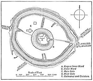 An early 12th-century observer, William of Malmesbury, called Sarum a town "more like a castle than city, being environed with a high wall", and noted that "notwithstanding that it was very well accommodated with all other conveniences, yet such was the want for water that it sold at a great rate".[18] Holinshed denied this and noted that the hill was "very plentifully served with springs and wells of very sweet water";[27] excavation has discovered numerous wells (including one within the Norman keep) but suggests that they were so deep as to make their use more cumbersome than carting water uphill from the rivers. The issue was presented to kings Richard and John as the prime reason to relocate the cathedral[27] but seems to have only been part of the issue.
