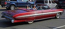 Introduced in January 1961 as a convertible, the Starfire was separated into its own model line and shared its body and wheelbase with the Super 88 and the lower-priced Dynamic 88. It was loaded with standard equipment including leather bucket seats, center console with tachometer[5] and floor shifter for the Hydra-matic transmission, and was the first U.S. full-sized production car to feature an automatic transmission with a console-mounted floor shifter, brushed aluminum side panels and power steering, brakes, windows and driver's seat.[6] With a base price of $4,647 in 1961, it was the most expensive Oldsmobile, even more than the larger Ninety-Eight models. The standard 394 cubic inch V-8 Skyrocket V8 engine - Oldsmobile's most powerful in 1961 - used a 4-barrel Rochester carburetor and generated 330 hp (246 kW) at 4600 rpm. Sales of the 1961 model were 1,500.