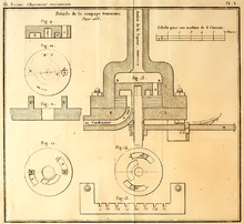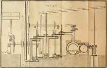 The book begins with an introductory discussion of the principles of steam engines and the relevant physical principles, as well as designs for the Evans high-pressure steam engine, boilers, screw-mills and others.[70] Evans developed a similar suite of tools and tables for potential steam engineers as he had for potential millers, such as tables itemizing the heat and pressure tolerances of various metals, instructions for assembling the basic components of a steam-powered system, and schematics for useful components such as valves and boilers. Evans also used the book to justify the safety of high-pressure steam engines if properly constructed, despite the fact that by this time Evans himself had experienced several boiler explosions in his workshop.[71] However, thermodynamics were little understood in his time. As such, many of Evans's theoretical contentions, including the 'grand principle' of steam he develops to guide the mathematical modelling of pressure and fuel in steam engines, were substantially flawed. Although Evans was to be quite successful in the development of high-pressure steam engines (and his designs were widely used), his theoretical understanding of them was limited and he was generally unable to accurately predict the inputs and outputs of his machines.[72] The guide also indulged in a far wider range of topics of interest to Evans, including a compendium of inventions from others which he deemed to be worthy of further circulation—such as a straw-cutter and flour press developed by his brother Evan, and a horse-drawn scraper and earth mover invented by Gershom Johnson.[73] Evans also used the opportunity to encourage government sponsorship of research:
