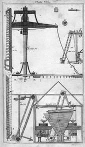 In 1783, two of Evans's brothers began building a mill in Newport on part of the family's farm estate which they purchased from their father, and Evans was recruited to oversee its construction on the Red Clay Creek. When the mill opened in 1785 it was of a conventional design, but over the next five years Evans began to experiment with inventions to reduce the reliance upon labor for milling. Moving wheat from the bottom to the top of the mill to begin the process was the most onerous task of all in contemporary mills. Evans's first innovation was a bucket elevator to facilitate this process. Chains of buckets to raise water was a Roman technology had been used in various guises since antiquity. Evans had seen diagrams of their use for marine applications and realized with some modification and careful engineering they could be used to raise grain, so a series of bucket elevators around a mill could move grain and flour from one process to the next.[14] Another labor-intensive task was that of spreading meal. This came out of the grinding process warm and moist, needing cooling and drying before it could be sifted and packed. Traditionally the task was done by manually shoveling meal across large floors. In response, Evans developed the "hopper boy", a device which gathered meal from a bucket elevator and spread it evenly over the drying floor—a mechanical rake would revolve around the floorspace. This would even out newly deposited meal for cooling and drying, while a gentle incline in the design of the rake blades would slowly move the flour towards central chutes, from which the material would be sifted.[15] Used in conjunction, the two innovations saved many hours of labor and greatly reduced the risk of contamination.[A]