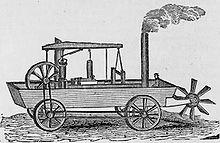 Despite this setback, within a year Evans had found a client. The Philadelphia Board of Health was concerned with the problem of dredging and cleaning the city's dockyards and removing sandbars: in 1805 Evans convinced them to contract him to develop a steam-powered dredge. The result was the Oruktor Amphibolos, or "Amphibious Digger". The vessel consisted of a flat-bottomed scow with bucket chains to bring up mud and hooks to clear away sticks, stones and other obstacles. Power for the dredging equipment and propulsion was supplied by a high-pressure Evans engine.[59] The end result was a craft nearly thirty feet long, twelve feet wide and weighing some seventeen tons. To move this ungainly hulk to the waterfront, as well to give a demonstration of his long-held beliefs in the possibility of land-based steam transportation, Evans mounted the hull on four wheels (twice, as the first set collapsed under the weight) and connected the engine to them in order to drive the Oruktor from his workshop through the Philadelphia streets on the way to the Schuylkill River on July 13, 1805.[60] The Oruktor Amphibolos is thus believed to have been the first automobile in the United States, and the first motorized amphibious craft in the world.[61][62] However, very few contemporary accounts of the craft survive, and Evans's tendency to exaggerate its success in his own annals make verification of its performance difficult. Although Evans himself claimed it proceeded successfully around Philadelphia (and circled his erstwhile rival Benjamin Latrobe's Philadelphia waterworks) before launching into the river and paddling at speed to Philadelphia harbor; the great weight of the craft make land-propulsion based on its limited engine capacity and jury-rigged power train fairly improbable over any significant distance.[63] It is similarly unknown how well, if at all, the Oruktor functioned as a steamboat, and Evans's claims on this point vary significantly over the years. Nevertheless, it is known that the invention proved ineffective for its ostensible purpose as a dredger, and it was scrapped for parts by the Board of Health in 1808.[63] Nevertheless, Evans's ideas of steam carriages were not an impossible dream.[64] Evans would continue to promote the idea. In 1812 he published a futuristic description of a world connected by a network of shipping lines railroad tracks and steam locomotives, accurately describing what will happen in the future. long before any such potential could be realized: