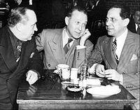 Universal made three more comedies with the team. Crazy House (1943) had Olsen and Johnson running amok through the Universal studio and evacuating the staff, including Universal regulars Basil Rathbone and Nigel Bruce, Johnny Mack Brown, and Andy Devine. When Olsen and Johnson present themselves at the head office with the announcement "Universal's most sensational comedy team outside!", the studio chief replies, "Oh, Abbott and Costello! Send them right in!"[1] In Ghost Catchers (1944), Ole and Chic help singer Gloria Jean make her Carnegie Hall debut despite strange happenings in a spooky old house. See My Lawyer (1945) was a patchwork of vaudeville acts, with Olsen and Johnson noticeably absent from most of the proceedings. After completing this last film, Olsen and Johnson resumed their stage career, mounting variations of Hellzapoppin'.