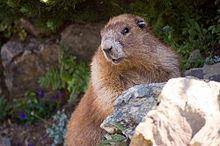 Olympic marmots eat meadow flora such as avalanche and glacier lilies, heather blossoms, subalpine lupine, mountain buckwheat, harebells, sedges, and mosses.[2][23] They prefer green, tender, flowering plants over other sources of food, but roots are a large part of their diets in the early spring when other plants have not yet appeared.[25] During May and June, they may resort to gnawing on trees for food.[15] They also occasionally eat fruits and insects.[16] Their water requirements are met from the juice in the vegetation they eat and dew on the plants' surfaces.[25]