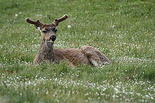 The park also provides habitat for many species (like the Roosevelt elk) that are native only to the Pacific Northwest coast. As a result, scientists have declared it a biological reserve and study its unique species to better understand how plants and animals evolve. The park is home to sizable populations of black bears and black-tailed deer. The park also has a noteworthy cougar population, numbering about 150.[14] Mountain goats were accidentally introduced into the park into the 1920s and have caused much damage on the native flora. The NPS has activated management plans to control the goats.[15] The park contains an estimated 366,000 acres (572 sq mi; 1,480 km2) of old-growth forests.[16]