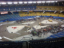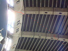 In 1999, a 350 m2 (3,770 sq ft) portion of the roof collapsed on January 18, dumping ice and snow on workers that were setting up for the annual Montreal Auto Show.[18][23] The auto show and a boat show the following month were canceled,[24] and the auto show left the venue for good (since then, the Montreal Auto Show has usually been held at the Palais des congrès de Montréal). Repaired once again, the roof was modified to better withstand winter conditions: the OIB installed a network of pipes to circulate heated water under the roof to allow for snow melting. Despite these corrective measures, the stadium floor remained closed from December to March.[25] Birdair, the fabric provider and designer of the roof, was later sued for the roof failure.[26] The installer of the roof, Danny's Construction, having suffered tremendous cost overruns along with its subcontractor Montacier, due to changes in the plans and specifications and delays, was terminated during the construction, and Birdair completed the project. Danny's Construction sued Birdair in 1999.[27] In February 2010, after a lengthy trial, the Quebec Superior Court awarded a judgement in favour of Danny's Construction and dismissed Birdair's countersuit.[28]