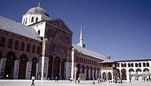 In 691/92, Abd al-Malik completed the Dome of the Rock in Jerusalem,[112][113] It was possibly intended as a monument of victory over the Christians that would distinguish Islam's uniqueness within the common Abrahamic setting of Jerusalem, home of the two older Abrahamic faiths, Judaism and Christianity.[114][115] An alternative motive may have been to divert the religious focus of Muslims in the Umayyad realm from the Ka'aba in Zubayrid Mecca (683–692), where the Umayyads were routinely condemned during the Hajj.[114][116][115] In Damascus, al-Walid confiscated the cathedral of St. John the Baptist and founded the Great Mosque in its place as a "symbol of the political supremacy and moral prestige of Islam", according to historian Nikita Elisséeff.[117] Noting al-Walid's awareness of architecture's propaganda value, historian Robert Hillenbrand calls the Damascus mosque a "victory monument" intended as a "visible statement of Muslim supremacy and permanence".[118]