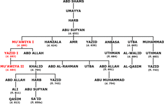 The next major challenge to Yazid's rule emanated from the Hejaz where Abd Allah ibn al-Zubayr, the son of al-Zubayr ibn al-Awwam and grandson of Abu Bakr, advocated for a shura among the Quraysh to elect the caliph and rallied opposition to the Umayyads from his headquarters in Islam's holiest sanctuary, the Ka'aba in Mecca.[70] The Ansar and Quraysh of Medina also took up the anti-Umayyad cause and in 683 expelled the Umayyads from the city.[71] Yazid's Syrian troops routed the Medinese at the Battle of al-Harra and subsequently plundered Medina before besieging Ibn al-Zubayr in Mecca.[72] The Syrians withdrew upon news of Yazid's death in 683, after which Ibn al-Zubayr declared himself caliph and soon after gained recognition in most provinces of the Caliphate, including Iraq and Egypt.[73] In Syria Ibn Bahdal secured the succession of Yazid's son and appointed successor Mu'awiya II, whose authority was likely restricted to Damascus and Syria's southern districts.[72][74] Mu'awiya II had been ill from the beginning of his accession, with al-Dahhak assuming the practical duties of his office, and he died in early 684 without naming a successor.[75] His death marked the end of the Umayyads' Sufyanid ruling house, called after Mu'awiya I's father Abu Sufyan.[76] The eldest surviving Sufyanid, al-Walid ibn Utba, the son of Mu'awiya I's full brother, died shortly after Mu'awiya II's death, while another paternal uncle of the deceased caliph, Uthman ibn Anbasa ibn Abi Sufyan, who had support from the Kalb of the Jordan district, recognized the caliphate of his maternal uncle Ibn al-Zubayr.[74] Ibn Bahdal favored Mu'awiya II's brothers Khalid and Abd Allah for the succession, but they were viewed as too young and inexperienced by most of the pro-Umayyad tribal nobility in Syria.[77][78]