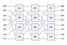 An 8x8 Omega network is a multistage interconnection network, meaning that processing elements (PEs) are connected using multiple stages of switches. Inputs and outputs are given addresses as shown in the figure. The outputs from each stage are connected to the inputs of the next stage using a perfect shuffle connection system. This means that the connections at each stage represent the movement of a deck of cards divided into 2 equal decks and then shuffled together, with each card from one deck alternating with the corresponding card from the other deck. In terms of binary representation of the PEs, each stage of the perfect shuffle can be thought of as a cyclic logical left shift; each bit in the address is shifted once to the left, with the most significant bit moving to the least significant bit.