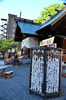 O-mikuji (御御籤, 御神籤, or おみくじ[1]) are random fortunes written on strips of paper at Shinto shrines and Buddhist temples in Japan. Literally "sacred lot", these are usually received by making a small offering (generally a five-yen coin as it is considered good luck) and randomly choosing one from a box, hoping for the resulting fortune to be good. As of 2011, coin-slot machines sometimes dispense o-mikuji.