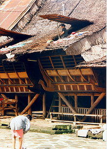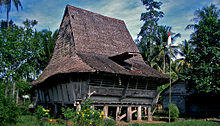 The Omo sebua is a traditional house style of the Nias people from Nias island, Indonesia. They are built only for the houses of village's chiefs. Situated in the centre of a village, omo sebua are built on massive ironwood piles and have towering roofs. Nias culture, with former frequent inter-village warfare, has made the design of omo sebua impregnable to attack. The houses' sole access is through a narrow staircase with a small trap door above. The steeply pitched roofs can reach 16 metres (50 feet) in height. Apart from a strong defense against enemies, omo sebua have proven earthquake resistance.