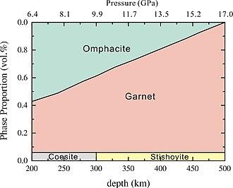 Omphacite is the dominated phase in the subducted oceanic crust in the Earth's upper mantle. The Mid-Ocean Ridge Basalt, which makes up oceanic crust, goes through ultrahigh-pressure metamorphic process and transforms to eclogite at depth ~60 km in the subduction zones.[8] The major mineral components of eclogite include omphacite, garnet and high-pressure silica phases (coesite and stishovite).[7] As depth increases, the omphacite in eclogite gradually transforms to majoritic garnet. Omphacite is stable up to 500 km depth in the Earth's interior.[7][9] Considering the cold geotherm of subducted slabs, omphacite can be stable even in deeper mantle.