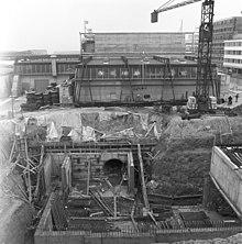 The "Finance Committee" for the project set up with five members, then extended to 12. As the term "Finance Committee" had other connotations, it was decided 'until a better name was found' to call the project ISOLDE and the committee the ISOLDE Committee.[8] In May 1966, the Synchro-Cyclotron shut down for some major modifications. One of these modifications was the construction of a new tunnel to send proton beams to a future underground hall that would be dedicated to ISOLDE.[9] In 1965, as the underground hall at CERN was being excavated, the isotope separator for ISOLDE was being constructed in Aarhus. Separator construction made good progress in 1966 and the underground hall was finished in 1967. On 16 October 1967, the first experiment carried out and successfully.[10]