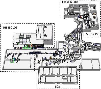 The facility building was extended in 2005 to allow more experiments to be set up. ISCOOL, an ion cooler and buncher, increasing the beam quality for experiments was installed at the facility in 2007.[22] Furthermore, HIE-ISOLDE (High Intensity and Energy Upgrade), a project for upgrading beam intensity and energy, was approved in 2009 and has been completed in several phases.[23] [24] [25] In late 2013 the construction of a new facility for medical research called CERN MEDICIS (MEDICal Isotopes Collected from ISOLDE) started. The facility is designed to work with proton beams that have already passed a first target. Of the incident beams, only 10% are actually stopped in the targets and achieve their objective, while the remaining 90% are not used.[26]