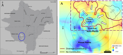 Ontario Lacus may resemble a semi-arid shallow depression lying in an alluvial fan where the water table height (of liquid hydrocarbons) rises above the elevation of the depression floor, analogous to the Etosha Pan in Namibia.[6] Hydrological runoff models have found evidence for an extensive basin catchment area for the lake, suggesting seasonal rainfall may be responsible for filling liquids in the local depression. This situation may be analogous to the ephemeral filling of Lake Eyre in Australia due to its notably large catchment area and the semi-arid climate of central Australia.[7]
