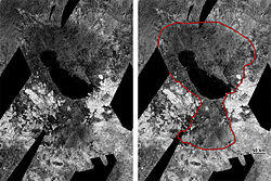 Infrared observations show that the southwest shoreline of the lake receded 9–11 km over four years (2005-2009), evidently due to evaporation during the dry southern hemisphere autumn.[4] Over the same interval, no change was observed in the south or southeast shorelines, indicating steeper slopes there. The sizes of northern hemisphere lakes and maria, in contrast, have been much more stable.[4]