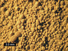 Ooids are small (commonly ≤2 mm in diameter), spheroidal, "coated" (layered) sedimentary grains, usually composed of calcium carbonate, but sometimes made up of iron- or phosphate-based minerals. Ooids usually form on the sea floor, most commonly in shallow tropical seas (around the Bahamas, for example, or in the Persian Gulf). After being buried under additional sediment, these ooid grains can be cemented together to form a sedimentary rock called an oolite. Oolites usually consist of calcium carbonate; these belong to the limestone rock family. Pisoids are similar to ooids, but are larger than 2 mm in diameter, often considerably larger, as with the pisoids in the hot springs at Carlsbad (Karlovy Vary) in the Czech Republic.