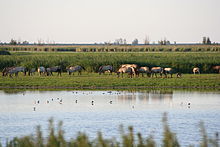 The Oostvaardersplassen (Dutch pronunciation: [oːstˈfaːrdərsˌplɑsə(n)]) is a nature reserve in the Netherlands, which is managed by the State Forestry Service. Covering about 56 square kilometres (22 sq mi), it is noted as an experiment[2][3][4] of rewilding.[5] It is in a polder which was created in 1968; by 1989, its ecological interest had resulted in its being declared a Ramsar wetland.[6] It became part of Nieuw Land National Park when it was created in 2018.
