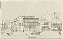 The first stone was laid on July 1, 1818 by Mademoiselle Mars.[1] Built according to the plan of the architect Auguste Dukers, the theatre in the neoclassical style has a massive parallelepipedic shape. Its main façade is decorated with a marble colonnade[alpha 1] limited by a balustrade and overlooking the arcades on the ground floor.