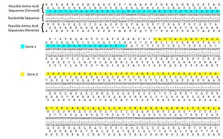 In molecular genetics, an open reading frame (ORF) is the part of a reading frame that has the ability to be translated. An ORF is a continuous stretch of codons that begins with a start codon (usually AUG) and ends at a stop codon (usually UAA, UAG or UGA).[1] An ATG codon (AUG in terms of RNA) within the ORF (not necessarily the first) may indicate where translation starts. The transcription termination site is located after the ORF, beyond the translation stop codon. If transcription were to cease before the stop codon, an incomplete protein would be made during translation.[2] In eukaryotic genes with multiple exons, introns are removed and exons are then joined together after transcription to yield the final mRNA for protein translation. In the context of gene finding, the start-stop definition of an ORF therefore only applies to spliced mRNAs, not genomic DNA, since introns may contain stop codons and/or cause shifts between reading frames. An alternative definition says that an ORF is a sequence that has a length divisible by three and is bounded by stop codons.[3][4] This more general definition can also be useful in the context of transcriptomics and/or metagenomics, where start and/or stop codon may not be present in the obtained sequences. Such an ORF corresponds to parts of a gene rather than the complete gene.