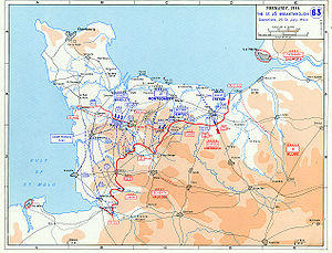 Operation Cobra was the codename for an offensive launched by the United States First Army under Lieutenant General Omar Bradley seven weeks after the D-Day landings, during the Normandy campaign of World War II. The intention was to take advantage of the distraction of the Germans by the British and Canadian attacks around Caen in Operation Goodwood,[12] and thereby break through the German defenses that were penning in their forces while the Germans were unbalanced. Once a corridor had been created, the First Army would then be able to advance into Brittany, rolling up the German flanks once free of the constraints of the bocage country. After a slow start, the offensive gathered momentum and German resistance collapsed as scattered remnants of broken units fought to escape to the Seine. Lacking the resources to cope with the situation, the German response was ineffectual and the entire Normandy front soon collapsed. Operation Cobra, together with concurrent offensives by the British Second Army and the Canadian First Army, was decisive in securing an Allied victory in the Normandy campaign.