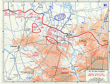 On 12 July, Bradley briefed his commanders on the Cobra plan, which consisted of three phases. The main effort would be under the control of VII Corps. In the first phase, the breakthrough attack would be conducted by the 9th Infantry Division (Major General Manton S. Eddy) and the 30th Infantry Division (Major General Leland Hobbs), which would break into the German defensive zone and then hold the flanks of the penetration while the 1st Infantry Division (Major General Clarence Huebner) and 2nd Armored Division (Major General Edward H. Brooks) pushed into the depth of the position until resistance collapsed.[48] The 1st Infantry Division "was to take Marigny, with this objective exploited by a stream of General Watson's 3rd Armored Division armor that would move south toward Coutances".[49] The 2nd Armored Division—part of "Collins' exploitation force" of the 2nd Armored Division in the east of the VII Corps sector and the "1st Infantry Division reinforced by Combat Command B (CCB) of the 3rd Armored division in the west"[50]—would "pass through the 30th Infantry Division sector ... and guard the overall American left flank."[49] If VII Corps succeeded, the western German position would become untenable, permitting a relatively easy advance to the southwest end of the bocage to cut off and seize the Brittany peninsula.[51][52] First Army intelligence estimated that no German counterattack would occur in the first few days after Cobra's launch and that if they did later, they would be no more than battalion-sized operations.[53]
