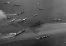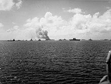To make room for the target ships, 100 short tons (90 t) of dynamite were used to remove coral heads from Bikini Lagoon. On the grounds of the David Taylor Model Basin outside Washington, DC, dress rehearsals for Baker were conducted with dynamite and model ships in a pond named "Little Bikini."[34] A fleet of 95 target vessels was assembled in Bikini Lagoon. At the center of the target cluster, the density was 20 ships per square mile (7.7 per km2), three to five times greater than military doctrine would allow. The stated goal was not to duplicate a realistic anchorage, but to measure damage as a function of distance from the blast center, at as many different distances as possible.[35] The arrangement also reflected the outcome of the Army/Navy disagreement about how many ships should be allowed to sink.[36]