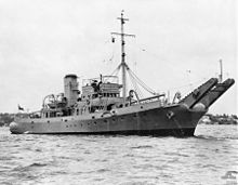 The British assembled a small fleet for Operation Hurricane that included the escort carrier HMS Campania, which served as the flagship, and the LSTs Narvik, Zeebrugge and Tracker, under the command of Rear Admiral A. D. Torlesse. Leonard Tyte from the AERE was appointed the technical director.[72] Campania had five aircraft embarked, three Westland WS-51 Dragonfly helicopters and two Supermarine Sea Otter amphibians. Between them, the LSTs carried five LCMs and twelve LCAs.[73] The bomb, less its radioactive components, was assembled at Foulness, and then taken to the River-class frigate HMS Plym on 5 June 1952 for transport to Australia.[74] It took Campania and Plym eight weeks to make the voyage, as they sailed around the Cape of Good Hope instead of traversing the Suez Canal,[72] because there was unrest in Egypt at the time.[75]