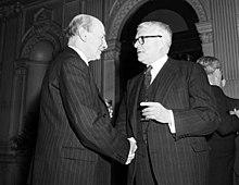 With the end of the war the Special Relationship between Britain and the United States "became very much less special".[12] The British government had trusted that America would share nuclear technology, which the British saw as a joint discovery,[13] but the terms of the Quebec Agreement remained secret. Senior members of the United States Congress were horrified when they discovered that it gave the British a veto over the use of nuclear weapons.[14] On 9 November 1945, the new British Prime Minister, Clement Attlee, and the Prime Minister of Canada, William Lyon Mackenzie King, went to Washington, DC, to confer with Truman about future cooperation in nuclear weapons and nuclear power.[15][16] They signed a Memorandum of Intention that replaced the Quebec Agreement. It made Canada a full partner, and reduced the obligation to obtain consent for the use of nuclear weapons to merely requiring consultation.[17] The three leaders agreed that there would be full and effective cooperation on civil and military applications of atomic energy, but the British were soon disappointed;[18] the Americans made it clear that cooperation was restricted to basic scientific research.[19] The Atomic Energy Act of 1946 (McMahon Act) ended technical cooperation. Its control of "restricted data" prevented the United States' allies from receiving any information.[20]